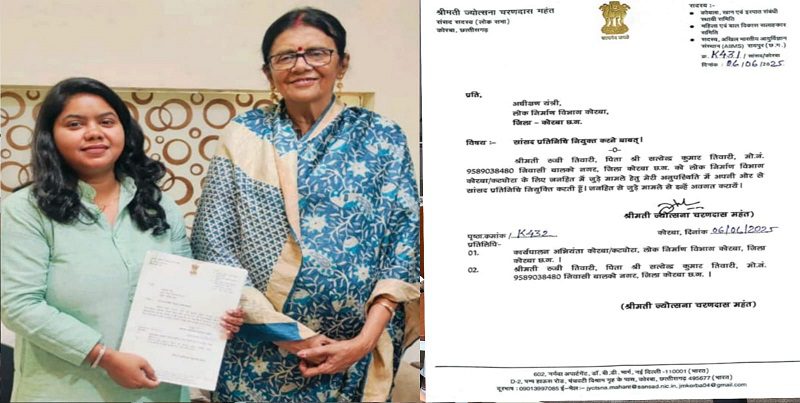 कोरबा,08 जून 2025। जिले की रूबी तिवारी को कोरबा लोकसभा की लोकप्रिय सांसद श्रीमती ज्योत्स्ना चरण दास महंत ने PWD विभाग कोरबा व कटघोरा का सांसद प्रतिनिधि नियुक्त किया है। रूबी तिवारी यूथ कांग्रेस की प्रदेश महासचिव हैं और सांसद श्रीमती ज्योत्स्ना चरण दास महंत की करीबी मानी जाती हैं। इस नई जिम्मेदारी के साथ, रूबी तिवारी को PWD विभाग कोरबा व कटघोरा के कार्यों की देखरेख करनी होगी। उन्हें विभाग की योजनाओं और परियोजनाओं को सफलतापूर्वक लागू करने की जिम्मेदारी सौंपी गई है।