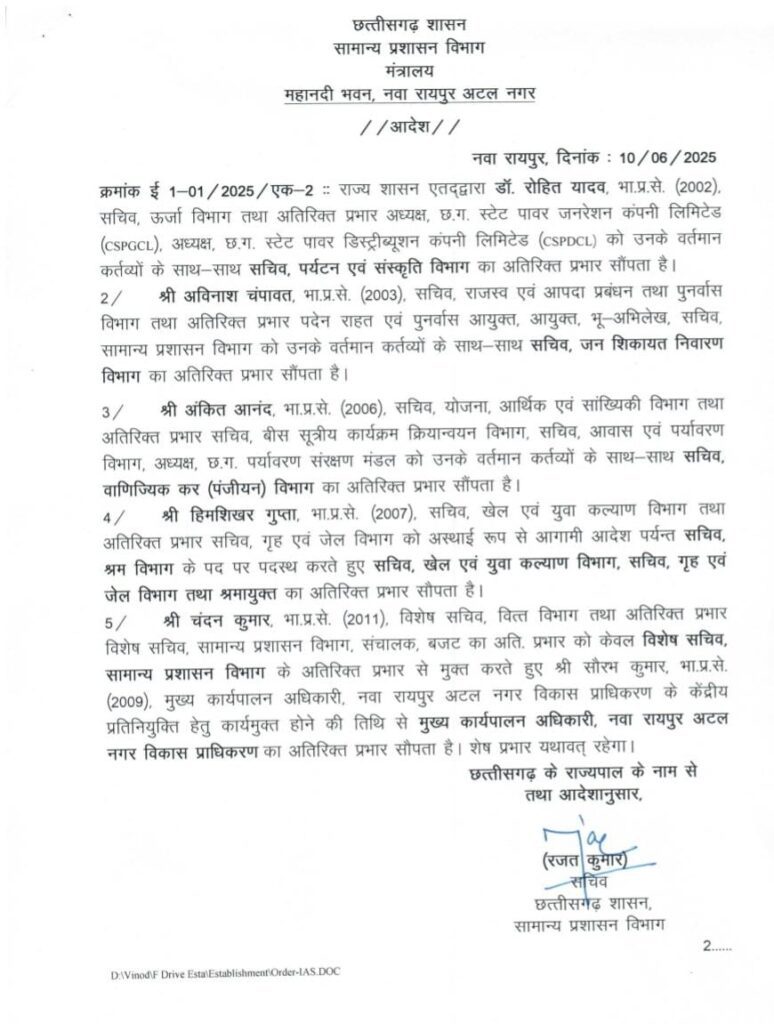 रायपुर। 5 IAS अफसरों के प्रभार में फेरबदल किया गया है। इस संबंध में सामान्य प्रशासन विभाग ने आदेश जारी किया है।