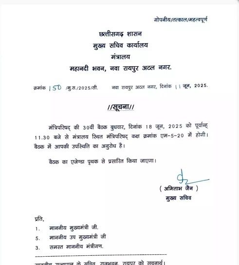 रायपुर,12जून 2025(वेदांत समाचार) । मुख्यमंत्री विष्णुदेव साय की अध्यक्षता में कैबिनेट की बैठक 18 जून की सुबह 11:30 बजे मंत्रालय महानदी भवन में आयोजित होगी। बैठक में मानसून सत्र में पेश होने वाले विधेयकों को मंजूरी मिल सकती है। साथ ही महत्वपूर्ण फैसलों पर भी मुहर लग सकती है।