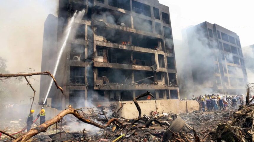 BJ मेडिकल कॉलेज के हॉस्टल पर गिरे एयर इंडिया के विमान की तस्वीरें भी सामने आई हैं. तस्वीरों में देखा जा सकता है कि विमान का पिछला हिस्सा हॉस्टल की बिल्डिंग से लटक रहा है. वहीं आगे का हिस्सा पूरी तरह से जल चुका है, जिससे धुएं का गुबार उठता दिखाई दे रहा था. फिलहाल मौके पर NDRF की तीन टीमें घटनास्थल पर रेस्क्यू ऑपेरशन चला रही हैं. इसके अलावा वडोदरा से NDRF की दो टीमें अहमदाबाद के लिए रवाना हो गई हैं. अहमदाबाद के सिविल अस्पताल तक ग्रीन कॉरिडोर बनाया गया है. घायलों को वहीं पर भर्ती कराया जा रहा है. अहमदाबाद के नगर आयुक्त और पुलिस कमिश्नर मौके पर मौजूद हैं.
