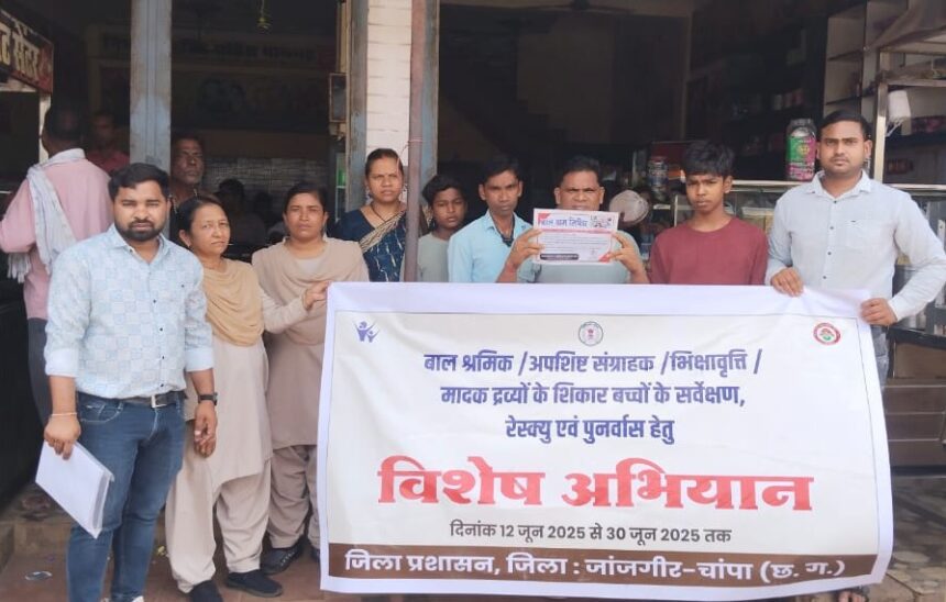 जांजगीर-चांपा 12 जून 2025। कलेक्टर जन्मेजय महोबे एवं पुलिस अधीक्षक विजय कुमार पांडेय के निर्देशन में बाल श्रम नीति के प्रभावी क्रियान्वयन हेतु बाल श्रमिक, अपशिष्ट संग्राहक, भिक्षावृत्ति, मादक द्रव्यों के शिकार बच्चों के सर्वेक्षण, रेस्क्यु एवं पुर्नवास हेतु अंर्तराष्ट्रीय बाल श्रम प्रतिषेध दिवस के अवसर पर जिले में 12 जून से 30 जून 2025 तक विशेष अभियान आयोजन किया जा रहा है। बाल श्रम उन्मुलन किए जाने तथा सड़क एवं सड़क जैसी परिस्थितियो में रहने वाले बालको हेतु पुर्नवास नीति ‘‘बाल सक्षम‘‘ जारी की गई है। अंतर्राष्ट्रीय बाल श्रम प्रतिषेध दिवस के अवसर पर सामूहिक रूप से बाल श्रम के प्रतिषेध की शपथ ली गई।