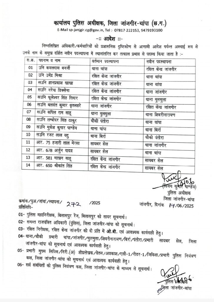 जांजगीर चांपा, 14 जून (वेदांत समाचार)। जिले में पुलिस महकमे में बड़ा बदलाव किया गया है। जिसके तहत 14 पुलिसकर्मियों k तबादला आदेश जारी किया है। यह आदेश पुलिस अधीक्षक विजय कुमार पाण्डेय ने जारी किया है।