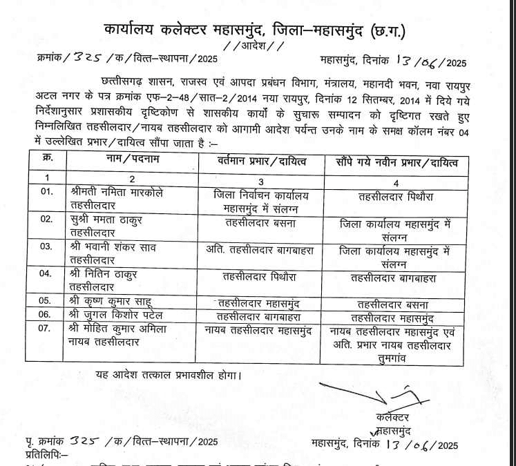 महासमुंद, 18 जून. कलेक्टर ने जिले के 7 तहसीलदारों का तबादला किया है. जिला निर्वाचन कार्यालय महासमुंद में संलग्न नमिता मारकोले को पिथौरा तहसीलदार की जिम्मेदारी दी गई है.