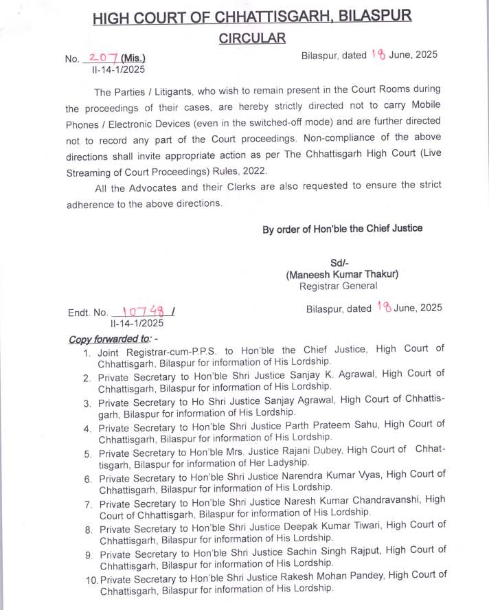 बिलासपुर, 18 जून । छत्तीसगढ़ हाई कोर्ट परिसर में अब मोबाइल फोन और अन्य इलेक्ट्रॉनिक उपकरणों को लेकर जाना पूरी तरह प्रतिबंधित कर दिया गया है। हाई कोर्ट के रजिस्ट्रार जनरल मनीष कुमार ठाकुर द्वारा जारी आदेश के मुताबिक, न्यायालय कक्ष में उपस्थित रहने वाले पक्षकारों और वादियों को स्पष्ट निर्देश दिए गए हैं कि वे मोबाइल या कोई भी इलेक्ट्रॉनिक डिवाइस (भले ही स्विच ऑफ मोड में हो) अंदर न ले जाएं।