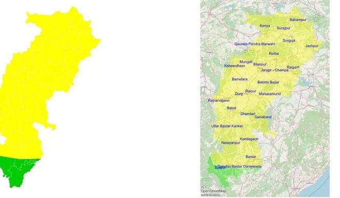 रायपुर,19जून 2025(वेदांत समाचार)। छत्तीसगढ़ के 27 जिलों में मौसम विभाग ने बारिश का येलो अलर्ट जारी किया है। मौसम विभाग के अनुसार, बीजापुर, दक्षिण बस्तर दंतेवाड़ा, बस्तर, नारायणपुर, कोंडागांव, उत्तर बस्तर कांकेर, धमतरी, बालोद, राजनांदगांव, गरियाबंद, महासमुंद, रायपुर, बलौदा बाजार, जांजगीर-चांपा, रायगढ़, बिलासपुर, कोरबा, जशपुर, गौरेला-पेंड्रा-मरवाही, दुर्ग, बेमेतरा, कबीरधाम, मुंगेली, सुरगुजा, सूरजपुर, कोरिया और बलरामपुर में हल्की बारिश की संभावना जताई गई है।