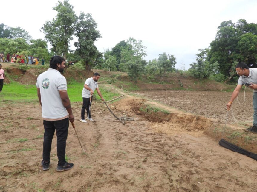 कोरबा, 20 जून 2025 । यह घटना दोपहर करीब 2 बजे तब सामने आई जब एक स्थानीय किसान अपने खेत में काम कर रहा था। अचानक उसे एक गड्ढे में कुछ हलचल दिखाई दी। पास जाकर देखने पर उसने देखा कि उसमें एक विशालकाय साँप मौजूद है। उसने तत्काल वन विभाग को सूचित किया और बताया कि उसके खेत में “पहाड़ चित्ती” निकली है, तब वन आरक्षक तुरंत उस स्थान पर पहुंचे और बताया की यह किंग कोबरा किंग कोबरा (Ophiophagus hannah) है, जिसे ग्रामीण पहाड़ चित्ती के नाम से भी जानते है।