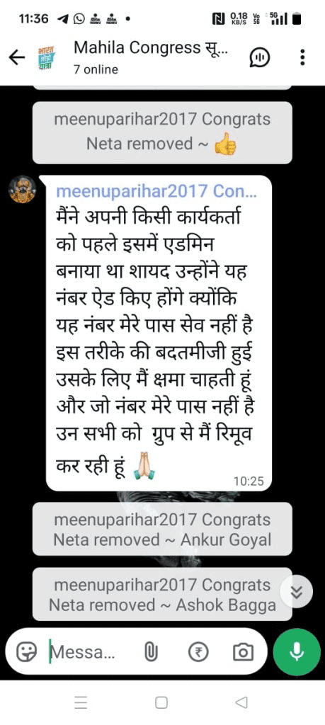 इसके साथ ही मीनू परिहार ने माफी मांगी है। एडमिन ने व्हाट्सएप ग्रुप से पोस्ट डिलीट कर लिखा कि ‘मैंने अपनी किसी कार्यकर्ता को पहले इसमें एडमिन बनाया था शायद उन्होंने यह नंबर ऐड किए होंगे, क्योंकि यह नंबर मेरे पास सेव नहीं है। इस तरीके की बदतमीजी हुई उसके लिए मैं क्षमा चाहती हूं और जो नंबर मेरे पास नहीं है उन सभी को ग्रुप से मैं रिमूव कर रही हूं।’
