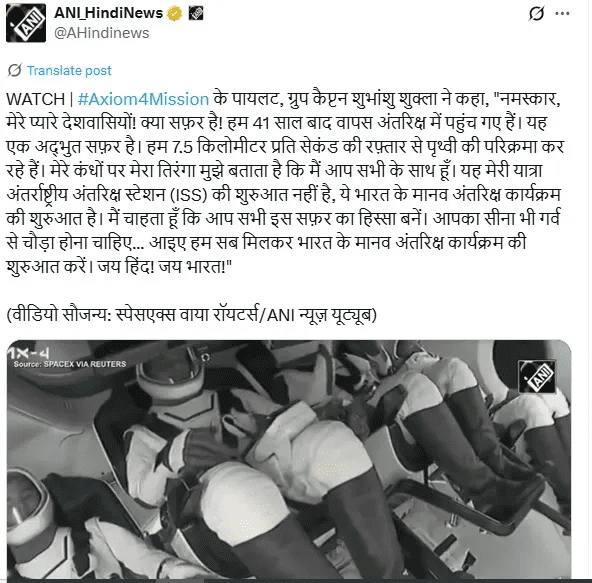 स्पेसक्राफ्ट से पहला मैसेज भेजते हुए शुभांशु ने कहा कि नमस्कार मेरे प्यारे देशवासियो, 41 साल बाद हम फिर से अंतरिक्ष में पहुंच गए हैं. इस समय हम 7.5 किलोमीटर प्रति घंटे की स्पीड से पृथ्वी के चारों ओर घूम रहे हैं. मेरे कंधे पर तिरंगा है, जो मुझे बता रहा है कि मैं अकेला नहीं हूं, आप सभी मेरे साथ है.