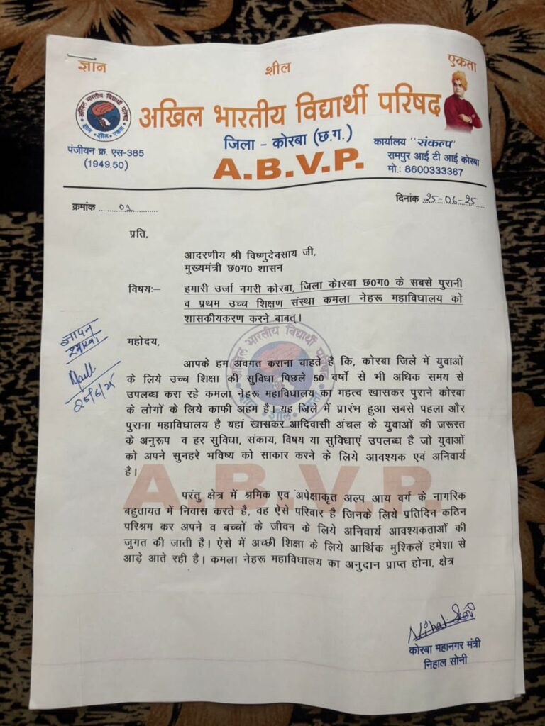 कोरबा, 26 जून (वेदांत समाचार)। अखिल भारतीय विद्यार्थी परिषद (अभाविप) के कार्यकर्ताओं ने कमला नेहरू महाविद्यालय, कोरबा को शासकीय घोषित किए जाने की मांग को लेकर मंगलवार को अपर कलेक्टर को ज्ञापन सौंपा।