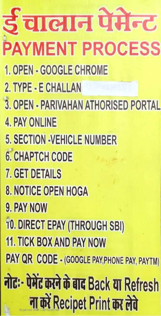 इसके पश्चात चालान का डिटेल आपकी स्क्रीन पर ओपन होगी तत्पश्चात आपकी स्क्रीन में दाहिने साइड Pay Now का ऑप्शन चालान का भुगतान करने हेतु प्राप्त होगा। जिसे टच करने पर दो ऑप्शन प्राप्त होगा जिसमें जाकर direct epay (through sbi) को क्लिक करेंगे। इसके पश्चात tick box and pay now का ऑप्शन प्राप्त होगा। इसके पश्चात आपकी स्क्रीन पर क्यूआर कोड ओपन होगा। जहां पर गूगल पे, फोन पे, पेटीएम आदि के माध्यम से ई-चालान का भुगतान आन लाइन तरीके सेवआप सुनिश्चित कर सकते हैं।