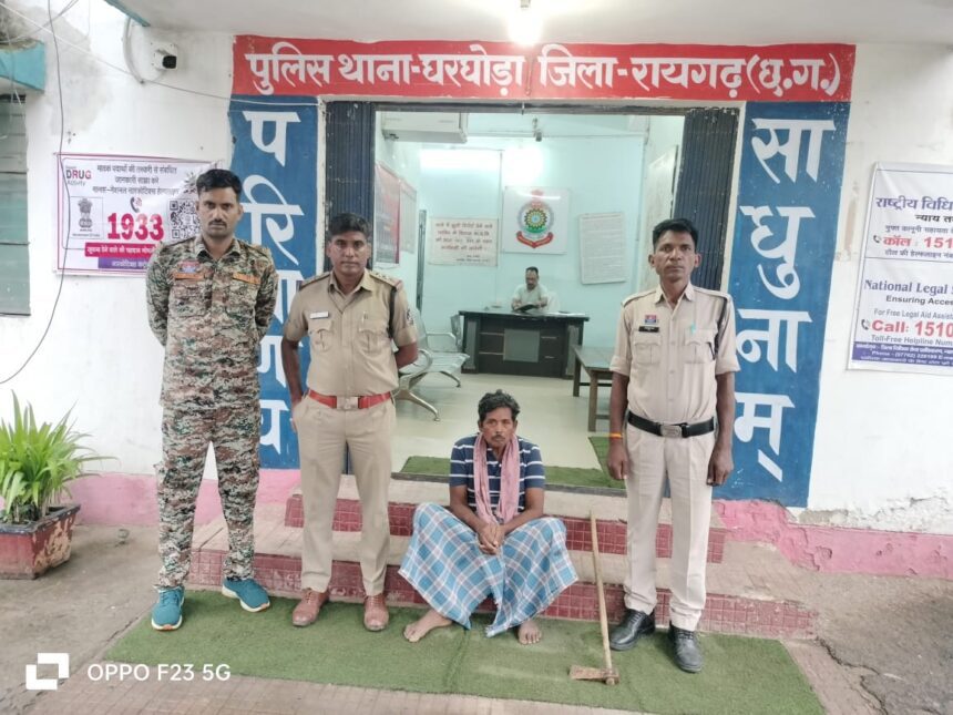 घटना की सूचना पर टीआई घरघोड़ा कुमार गौरव साहू तत्काल अपने स्टाफ के साथ मौके पर पहुंचे और आरोपी शिवचरण चौहान पिता स्व. बस्तीराम चौहान (उम्र 60 वर्ष), निवासी ग्राम बिजारी को हिरासत में ले लिया गया। पूछताछ में आरोपी ने जुर्म स्वीकार कर लिया है, आरोपी से प्रयुक्त आलाजरब एक लोहे का धारदार टांगी की जप्ती की गई है ।