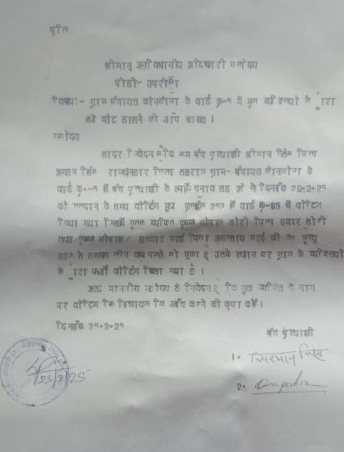 चौंकाने वाली इस शिकायत के मुताबिक यहां मतदान केंद्र क्रमांक 252 में दो ऐसे लोगों का भी मतदान हुआ है जिनकी मौत हो चुकी है। इन मृतकों के नाम से कोई फर्जी वोट डालकर चला गया लेकिन भीतर बैठे प्रत्याशियों के एजेंटों से लेकर मतदान कर्मियों के द्वारा सावधानी नहीं बरती गई। मतदान के दौरान मतदाता की प्रमाणिकता को लेकर देखे जाने वाले किसी भी एक परिचय पत्र का सही मिलान नहीं करने की वजह से और प्रत्याशियों के एजेंटों की लापरवाही के कारण फर्जी वोट पड़ गए। बाद में 25 फरवरी को इसकी शिकायत पंच प्रत्याशी की ओर से एसडीएम के समक्ष करते हुए फर्जी वोट डालने के मामले में जांच और कार्रवाई की मांग की गई है।