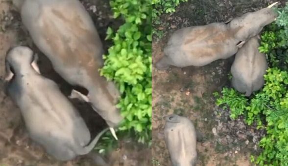 रायगढ़,29जून(वेदांत समाचार)। छत्तीसगढ़ के रायगढ़ जिला में एक बार फिर से हाथियों का एक वीडियो सामने आया है। जिसमें एक बड़ा नर हाथी छोटे शावक का पूंछ पकड़कर खींच रहा है। मानो उसे समझाईश दे रहा हो कि उधर नहीं जाना है। हाथी ट्रैकर ने इस वीडियो को ड्रोन कैमरे में कैद किया है। बताया जा रहा है कि छाल रेंज में 18 हाथी का झुंड था, जो अब दो दल में हो चुका है और इसमें से 8 हाथी का झुंड पुसल्दा के जंगल में विचरण कर रहा है। ऐसे मंे शुक्रवार की शाम को हाथी ट्रैकर दल की निगरानी कर रहे थे।