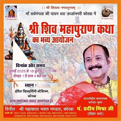 अत्यधिक वर्षा के कारण चयनित कथा स्थल खैर भावना कनबेरी मैदान तक वाहनों को आने जाने में भारी परेशानी की वजह से आनन फानन मे स्थान परिवर्तन का निर्णय लेना पड़ा l तथा प्रशासन की सहयोग से कोरबा के हृदय स्थल इंदिरा स्टेडियम में 12 जुलाई 2025 से 18 जुलाई 2025 सावन के पवित्र महीने मे पंडित प्रदीप मिश्रा जी सीहोर वाले के मुखारविंद से श्री महापुराण कथा का आयोजन किया जाएगा l कथा पूर्व निर्धारित समय अनुसार ही दोपहर 1:00 बजे से संध्या 4:00 बजे तक होगी सभी कथा प्रेमी शिव भक्तों से आग्रह है कि अधिक से अधिक संख्या में उपस्थित होकर कथा श्रवण करेंगे l