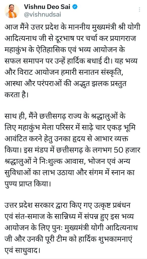 रायपुर,27फ़रवरी2025 (वेदांत समाचार)। मुख्यमंत्री भूपेश बघेल ने आज उत्तर प्रदेश के माननीय मुख्यमंत्री श्री योगी आदित्यनाथ जी से दूरभाष पर चर्चा कर प्रयागराज महाकुंभ के ऐतिहासिक एवं भव्य आयोजन के सफल समापन पर उन्हें हार्दिक बधाई दी।