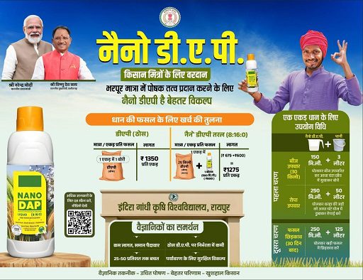 नैनो डीएपी एक आधुनिक, किफायती और प्रभावशाली तरल उर्वरक है, जो पारंपरिक डीएपी की तुलना में कहीं अधिक उपयोगी और पोषक तत्वों से भरपूर है। इंदिरा गांधी कृषि विश्वविद्यालय, रायपुर के वैज्ञानिकों ने नैनो डीएपी का समर्थन करते हुए कहा है कि इसके उपयोग से खेती की लागत में कमी आती है। नैनो डीएपी खेत में पोषण की कमी को प्रभावी ढंग से पूरा करता है और उत्पादन की गुणवत्ता को भी बढ़ाता है। नैनो डीएपी पर्यावरण के लिए भी सुरक्षित है। एक एकड़ धान की फसल के लिए एक बोरी ठोस डीएपी का उपयोग होता है। जिसकी लागत 1350 रूपए होती हैै, जबकि एक एकड़ में 25 किलो ठोस डीएपी और 500 मिली नैनो डीएपी के मिश्रण का उपयोग किया जाए तो इसकी लागत घटकर 1275 रूपए आती है।