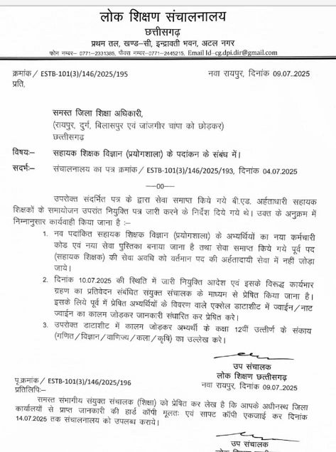 रायपुर,10जुलाई(वेदांत समाचार) । छत्तीसगढ़ में बर्खास्त बीएड डिग्रीधारी शिक्षकों को सहायक शिक्षक विज्ञान प्रयोगशाला के पद पर समायोजन तो मिल गया है, लेकिन उनकी पूर्व सेवा को अब लाभकारी सेवा में नहीं गिना जाएगा। संचालक लोक शिक्षण संचालनालय (DPI) ने साफ आदेश दिया है कि उनकी सीनियरिटी और सेवा गणना केवल नई नियुक्ति तिथि से ही की जाएगी।