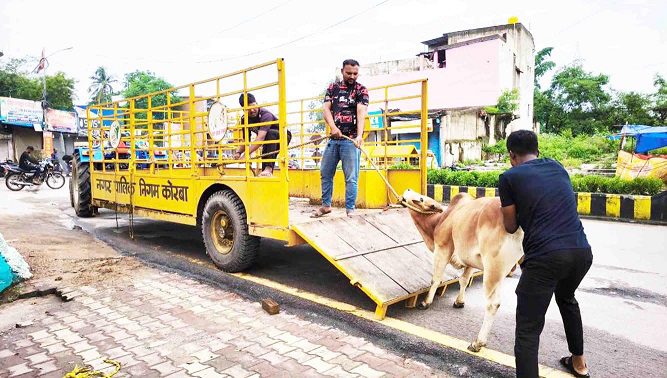 आवागमन बाधित होता है, यातायात व्यवस्था बिगडती है, साथ ही मवेशियों के घायल होने की आशंका बनी रहती है। नगर पालिक निगम कोरबा द्वारा सड़कों पर स्वच्छंद विचरण करने वाले मवेशियों को काऊकेचर के माध्यम से सड़क से उठाने तथा उन्हें सुरक्षित गोकुलनगर पहुंचाने की नियमित कार्यवाही की जा रही है, विगत एक पखवाडे़ के दौरान सड़कों से लगभग 06 दर्जन से अधिक मवेशियों को काऊकेचर के माध्यम से सुरक्षित उठाकर गोकुलनगर स्थित गोठान पहुंचाया गया है, जहॉं पर निगम द्वारा मवेशियों के चारे, पानी आदि की समुचित व्यवस्था भी की गई है।