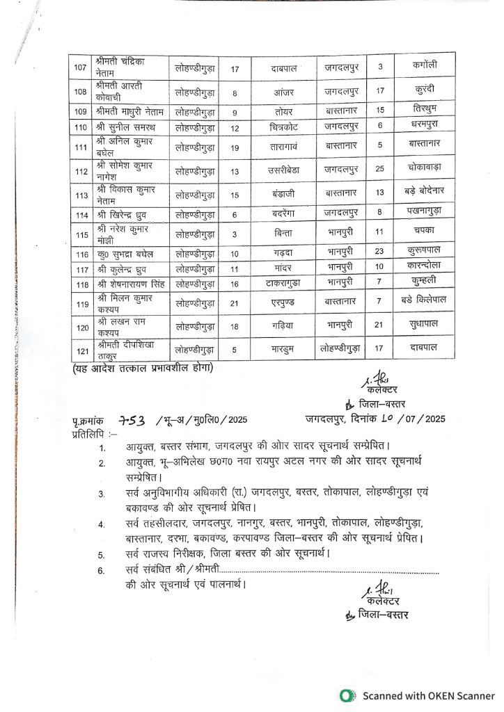 छत्तीसगढ़ के बस्तर जिले में बड़ा प्रशासनिक फेरबदल किया गया है. कलेक्टर हरीश एस ने जिले की सभी 10 तहसीलों के 121 पटवारियों का ट्रांसफर किया है. जारी आदेश में शामिल पटवारी 3 से 5 साल से एक ही जगह पदस्थ थे.