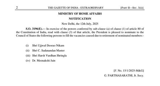 राष्ट्रपति ने इन चारों व्यक्तियों को राज्यसभा में संविधान के अनुच्छेद 80 (1)(a) और खंड (3) के तहत मनोनीत किया है, जो उन व्यक्तियों के लिए होता है जिन्होंने साहित्य, विज्ञान, कला और सामाजिक सेवा के क्षेत्र में विशेष योगदान दिया हो। ये नियुक्तियां नामित सदस्यों की सेवानिवृत्ति के कारण रिक्त हुए पदों को भरने के लिए की गई हैं।