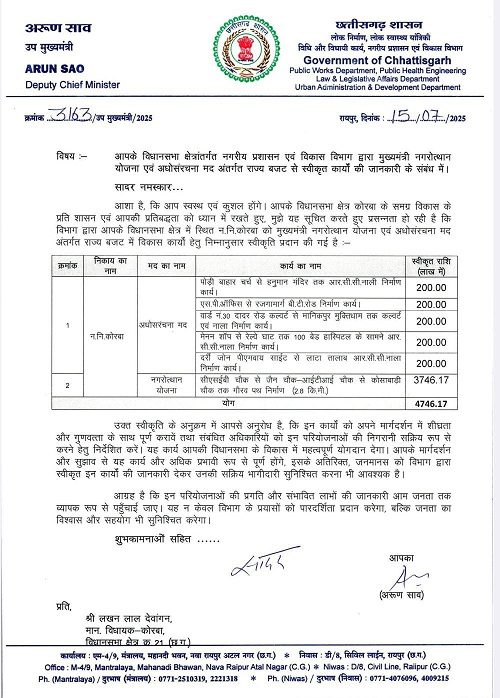 इस महत्वपूर्ण स्वीकृति के लिए उद्योग मंत्री लखन लाल देवांगन ने मुख्यमंत्री विष्णुदेव साय व उपमुख्यमंत्री अरुण साव का आभार जताया। उन्होंने कहा की माननीय मुख्यमंत्री विष्णु देव साय और माननीय उपमुख्यमंत्री अरुण साव के नेतृत्व और मार्गदर्शन में पूरे प्रदेश में विकास आज नए आयाम छू रहा है। कोरबा शहर में भी बीते डेढ़ वर्षों में 500 करोड़ से ज्यादा की स्वीकृति मिल चुकी है। जिन कार्यों की स्वीकृति आज मिली है, निश्चित तौर पर कोरबा शहर के अधोसंरचना के क्षेत्र में महत्वपूर्ण कदम है।