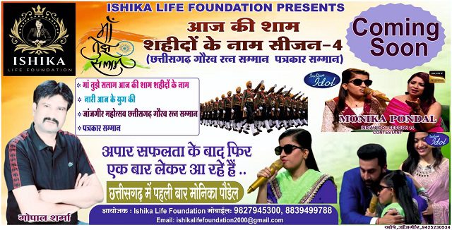 जांजगीर,16जुलाई(वेदांत समाचार)। छत्तीसगढ़ की पावन धरती पर एक बार फिर गूंजेगा देशभक्ति और गर्व का जयघोष। ISHIKA LIFE FOUNDATION द्वारा प्रस्तुत “माँ तुझे सलाम – शहीदों के नाम” सीजन-4 इस बार और भी भव्य रूप में लौट रहा है। इस आयोजन में छत्तीसगढ़ गौरव रत्न सम्मान और पत्रकार सम्मान जैसे गरिमामयी सत्रों का आयोजन किया जाएगा, जो न सिर्फ राज्य के विशिष्ट व्यक्तित्वों को सम्मानित करेगा बल्कि देशभक्ति की भावना से ओतप्रोत एक सांस्कृतिक संध्या का साक्षी बनेगा।