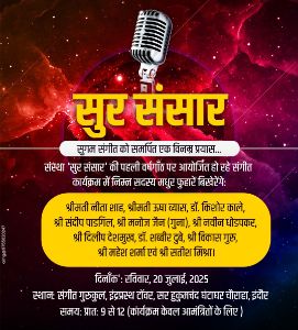 इंदौर, 19 जुलाई 2025। संगीत के क्षेत्र में उल्लेखनीय योगदान देने वाली संस्था “सुर संसार” अपनी पहली वर्षगांठ के अवसर पर एक भव्य संगीतमय कार्यक्रम का आयोजन करने जा रही है। यह समारोह 20 जुलाई 2025, रविवार को सुबह 9 बजे से दोपहर 12 बजे तक संगीत गुरुकुल, इंद्रप्रस्थ टॉवर, सर हुकुमचंद घंटाघर चौराहा, इंदौर में आयोजित होगा।