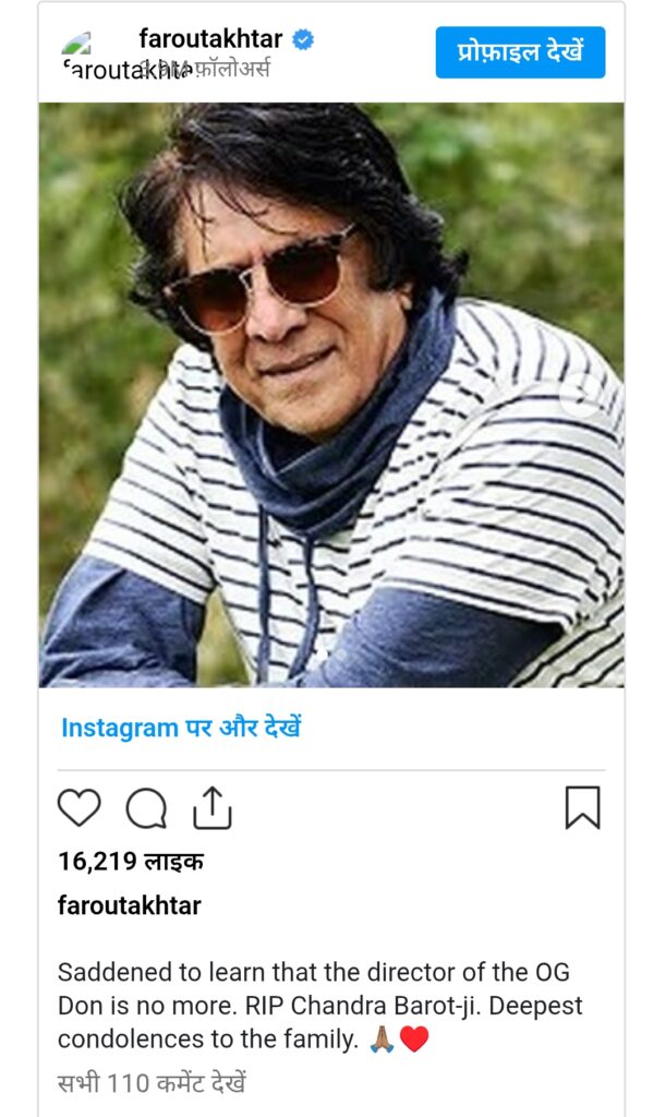 बॉलीवुड एक्टर और डायरेक्टर फराहन अख्तर ने चंद्र बरोट के निधन पर इंस्टाग्राम पुर उनकी एक तस्वीर शेयर करते हुए लिखा- “दुख हुआ ये जानकर कि ओजी फिल्म डॉन के डायरेक्टर अब नहीं रहे। बरोट जी की आत्मा को शांति मिले। परिवार के प्रति गहरी संवेदनाएं।”
