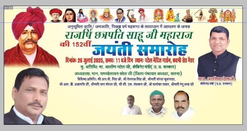 मैहर, 21 जुलाई 2025: मध्य प्रदेश के मैहर जिले में ओबीसी, एससी/एसटी महासभा के तत्वाधान में आरक्षण के जनक, समाज सुधारक राजर्षि छत्रपति साहू जी महाराज की 152वीं जयंती का भव्य आयोजन होने जा रहा है। यह समारोह 26 जुलाई 2025, शनिवार को सुबह 11 बजे पटेल मैरिज गार्डन, कटनी रोड, मैहर में आयोजित किया जाएगा। इस समारोह में मुख्य अतिथि के रूप में उत्तर प्रदेश सरकार के कैबिनेट मंत्री और अपना दल (एस) के राष्ट्रीय उपाध्यक्ष आशीष पटेल उपस्थित रहेंगे।