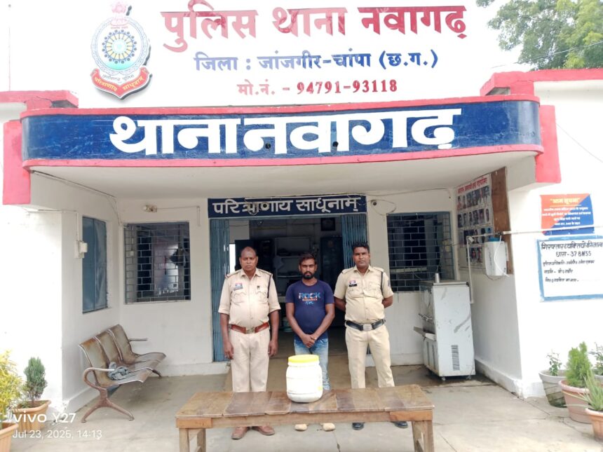 पुलिस अधीक्षक जांजगीर चांपा विजय कुमार पाण्डेय के निर्देशन में एवं अतिरिक्त पुलिस अधीक्षक उमेश कुमार कश्यप के कुशल मार्गदर्शन में जिला पुलिस जांजगीर द्वारा अवैध शराब बिक्री पर अंकुश लगाने के लिए लगातार कार्रवाई की जा रही है। इसी कड़ी में मुखबिर सूचना पर थाना नवागढ़ पुलिस द्वारा आरोपी विरु कश्यप के कब्जे से 08 लीटर अवैध कच्ची महुआ शराब कीमती 800 रुपये को बरामद किया गया।