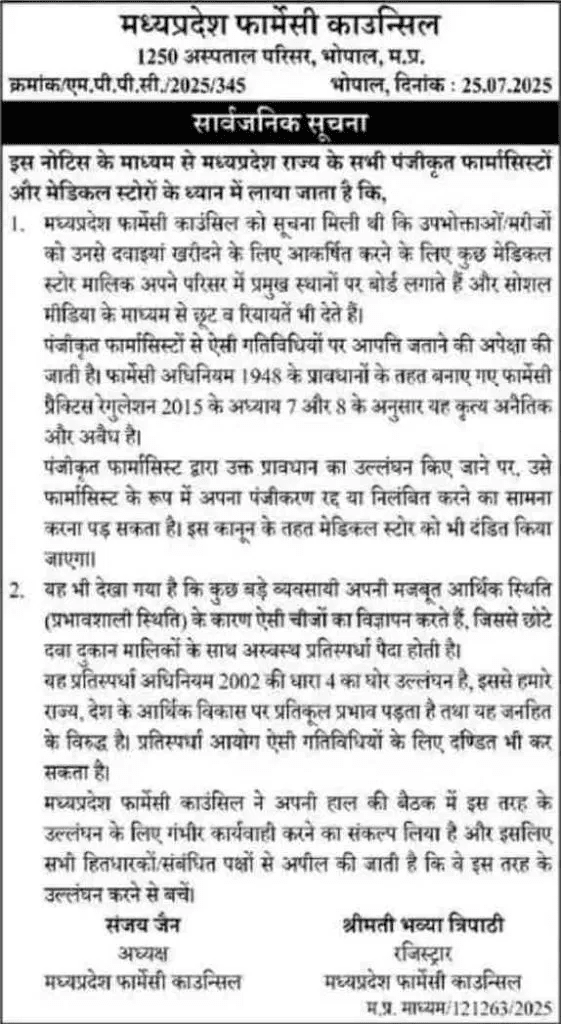 मध्यप्रदेश फार्मेसी काउंसिल अब दवा की दुकानों पर 10 से 80 प्रतिशत छूट का बोर्ड लगाने वाले स्टोर्स मालिकों के खिलाफ कार्रवाई करेगा। काउंसिल ने प्रदेशभर के पंजीकृत फार्मासिस्टों और मेडिकल स्टोर मालिकों को चेतावनी दी है। नोटिस जारी करते हुए काउंसिल ने कहा कि कई मेडिकल स्टोर बोर्ड और सोशल मीडिया के जरिए डिस्काउंट का लालच देकर उपभोक्ताओं को खींच रहे हैं, जो फॉर्मेसी प्रैक्टिस रेगुलेशन 2015 के अनुसार डिस्काउंट का लालच देना अनैतिक व्यापार है।
