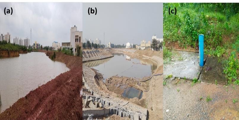 चित्र 1. (a) नवीनीकरण से पहले जल निकाय (b) नवीनीकरण के बाद जल निकाय और (c) वर्षा जल संचयन गड्ढे की स्थापना