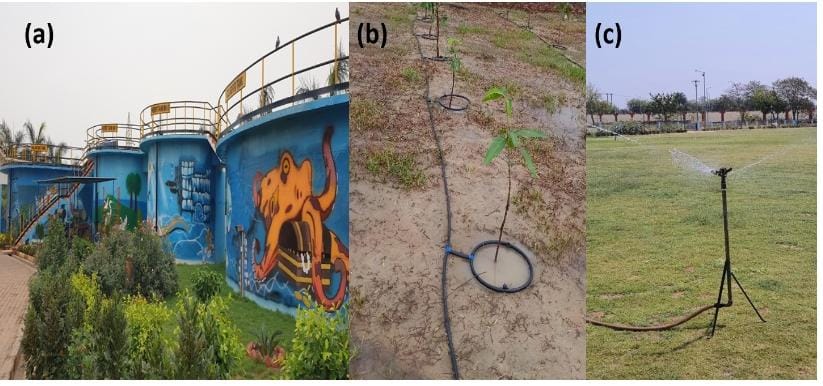 चित्र 2. (a) मैत्री नगर टाउनशिप में सीवेज उपचार संयंत्र (b) ड्रिप सिंचाई प्रणाली की छवि और (c) वृक्षारोपण के आसपास स्प्रिंकलर सिंचाई प्रणाली की छवि