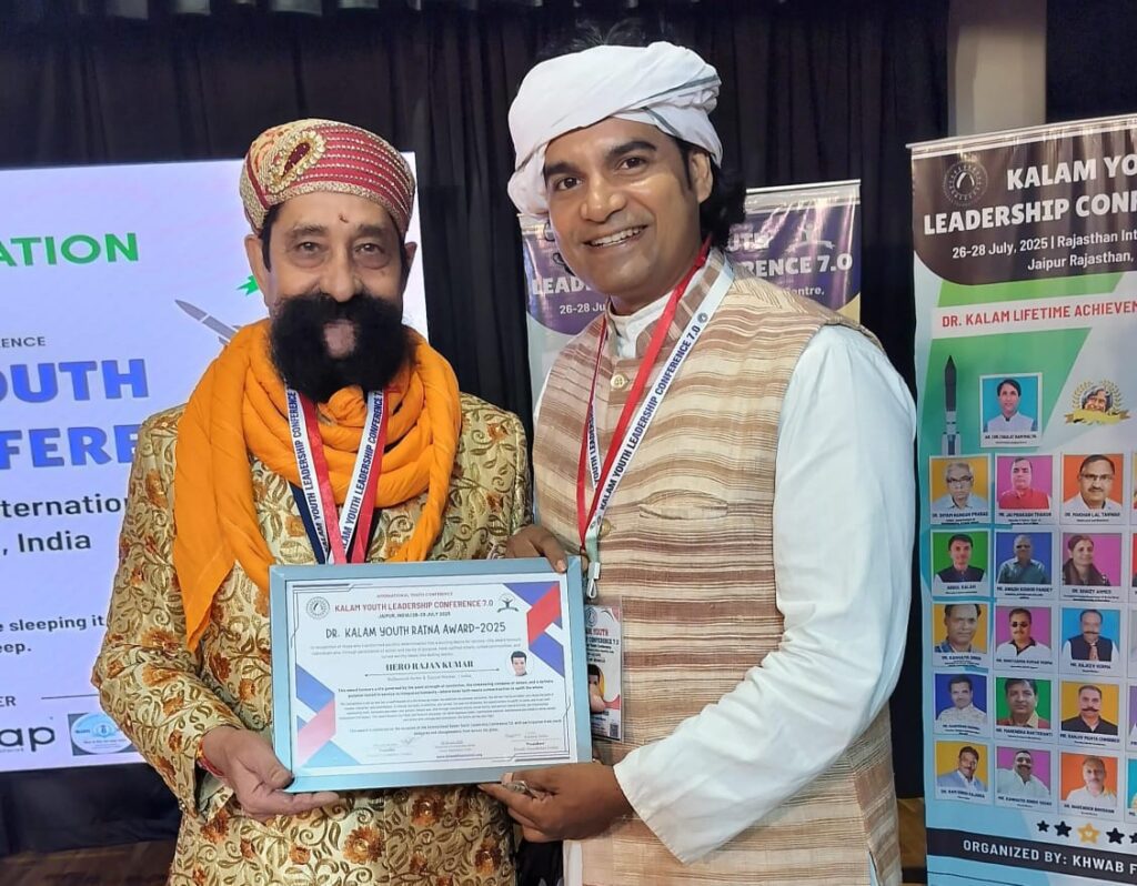 जयपुर । भारत के पूर्व राष्ट्रपति, महान वैज्ञानिक, प्रेरणादायक शिक्षक और मिसाइल मैन डॉ. एपीजे अब्दुल कलाम को हमेशा से अपनी आदर्श हस्ती मानने वाले हीरो राजन कुमार ऐतिहासिक पुरूस्कार “डॉ कलाम यूथ रत्न अवॉर्ड 2025” से सम्मानित किए गए। जयपुर के राजस्थान इंटरनेशनल सेंटर में दुनिया की सबसे बड़ी मूँछ रखने वाले और गिनिज बुक ऑफ वर्ल्ड रिकार्ड होल्डर रामसिंह चौहान के हाथो इलेक्शन कमिशन ऑफ इंडिया के आइकॉन और समाजसेवी हीरो राजन कुमार को यह अवॉर्ड मिलना मुंगेर और बिहार वासियों के लिए गर्व की बात है। हाल ही में उनकी फिल्म आखिर आई है। इस अवॉर्ड को मिलने के बाद उन्हें बधाइयों का तांता लगा हुआ है।