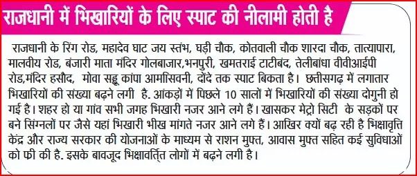 राजधानी के रिंग रोड, महादेव घाट जय स्तंभ, घड़ी चौक, कोतवाली चौक शारदा चौक, तात्यापारा, मालवीय रोड, बंजारी माता मंदिर गोलबाजार,भनपुरी, खमतराई टाटीबंद, तेलीबांधा वीवीआईपी रोड,मंदिर हसौद, मोवा सड्डू कांपा आमािसवनी, दोंदे तक स्पाट बिकता है। छत्तीसगढ़ में लगातार भिखारियों की संख्या बढऩे लगी है. आंकड़ों में पिछले 10 सालों में भिखारियों की संख्या दोगुनी हो गई है। शहर हो या गांव सभी जगह भिखारी नजर आने लगे हैं। खासकर मेट्रो सिटी के सडक़ों पर बने सिंग्नलों पर जैसे यहां भिखारी भीख मांगते नजर आने लगे हैं। आखिर क्यों बढ़ रही है भिक्षावृत्ति केंद्र और राज्य सरकार की योजनाओं के माध्यम से राशन मुफ्त, आवास मुफ्त सहित कई सुविधाओं को फ्री की है. इसके बावजूद भिक्षावर्ति्त लोगों में बढऩे लगी है।