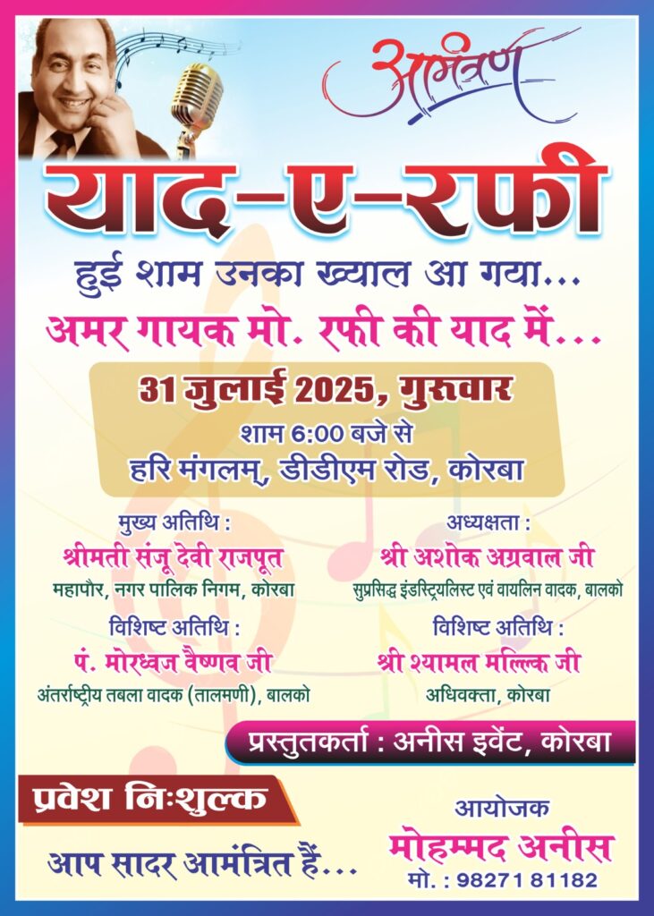 कोरबा, 31 जुलाई (वेदांत समाचार)। प्रतिवर्ष की भांति इस वर्ष भी 31 जुलाई 2025 को हरी मंगलम डी डी एम रोड में आयोजित याद-ए-राफी एक शाम को हरी मंगलम में शाम 6:00 बजे से रंगारंग संस्कृति कार्यक्रम का आयोजन मशहूर गायक मोहम्मद अनीश के नेतृत्व में संपन्न होने जा रहा है ।