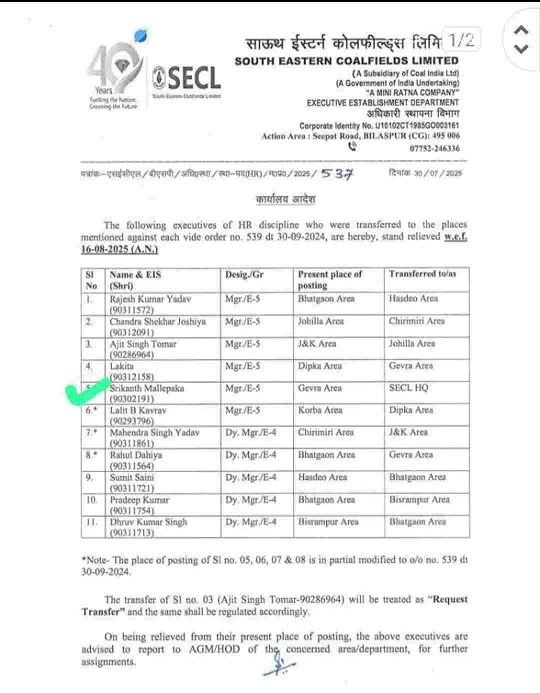 कोरबा,31 जुलाई (वेदांत समाचार)। SECL दीपका एरिया, गेवरा और कोरबा समेत अफसरों का तबादला किया गया है। इस संबंध में सूची के साथ कार्यमुक्त होने के आदेश भी जारी कर दिए गए हैं। इन अधिकारियों को 16 अगस्त तक कार्यमुक्त होने के आदेश दिए गए हैं। मानव संसाधन अनुशासन के पत्र के अनुसार ऐसे अधिकारी जिन्हें आदेश संख्या 539 दिनांक 30-09-2024 के तहत उल्लिखित स्थानों पर स्थानांतरित किया गया था, उन्हें एतद्द्वारा 16-08-2025 तक कार्यमुक्त किया जाता है।