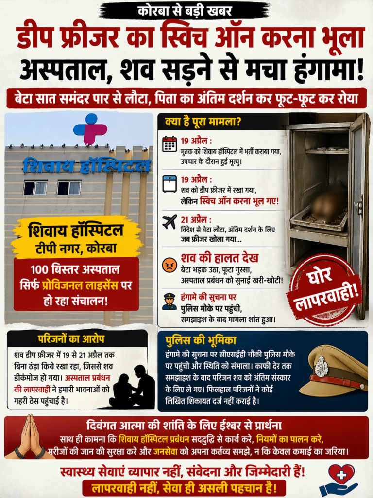 कोरबा, 21 अप्रैल (वेदांत समाचार)। शहर के टीपी नगर स्थित शिवाय हॉस्पिटल की बड़ी लापरवाही सामने आई है, जिसने एक परिवार की भावनाओं को गहरी ठेस पहुंचाई है। 100 बिस्तरों वाला अस्पताल होने के बावजूद केवल प्रोविजनल लाइसेंस पर संचालित इस अस्पताल में मृतक के शव को डीप फ्रीजर में रखने के बाद उसका स्विच चालू करना ही भूल गए। परिणामस्वरूप शव खराब हो गया।