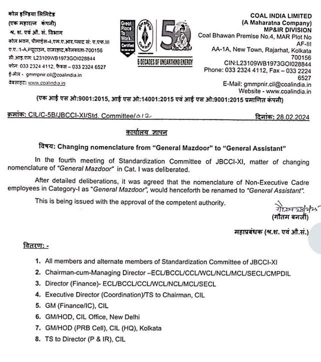 इस फैसले के बाद, कोल इंडिया के सभी जनरल मजदूरों को जनरल असिस्टेंट के रूप में संबोधित किया जाएगा। यह बदलाव कोल इंडिया के सभी कार्यालयों और खनन स्थलों पर लागू किया जाएगा।
