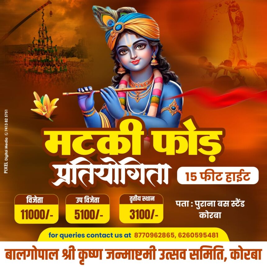 कोरबा,11 अगस्त 2025। बालगोपाल श्री कृष्ण जन्माष्टमी उत्सव समिति कोरबा द्वारा आगामी 16 अगस्त को पुराना बस स्टैंड कोरबा में पहली बार भव्य मटका फोड़ प्रतियोगिता का आयोजन किया जाएगा। शाम 6 बजे से शुरू होने वाले इस कार्यक्रम में 15 फीट ऊँचाई पर लटकी मटकी को फोड़ने के लिए टीमें अपनी ताकत और रणनीति दिखाएंगी।