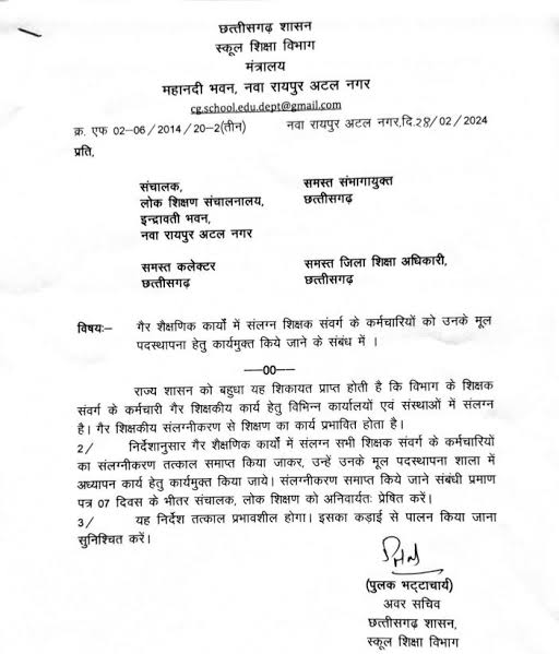 गौरतलब हो कि अवर सचिव छत्तीसगढ़ शासन स्कूल शिक्षा विभाग मंत्रालय महानदी भवन,नवा रायपुर अटल नगर के कार्यालयीन पत्र क्रमांक एफ -02-06/2014 /20 -2 (तीन ) नवा रायपुर अटल नगर दि.28/02 /2024 के तहत गैर शैक्षणिक कार्यों में संलग्न शिक्षक संवर्ग के कर्मचारियों को उनके मूल पदस्थापना स्थल हेतु कार्यमुक्त किए जाने आदेश जारी किया जा चुका है।