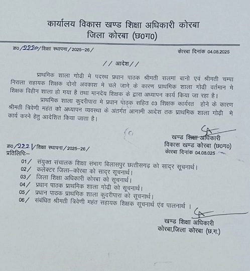 वहीं एक अन्य आदेश कोरबा विकासखंड से जारी हुआ है, जहां प्राथमिक शाला गोढ़ी में शिक्षक की कमी की वजह से शिक्षिका त्रिवेणी महंत को शिक्षा व्यवस्था के तहत आदेशित किया गया है। दरअसल प्राथमिक शाला गोढ़ी में दो शिक्षिका सलमा बानो और चंपा निराला पदस्थ है। लेकिन स्वास्थ्यगत वजहों से दोनों को छुट्टी दे दी गई है। ऐसे में गोढ़ी स्कूल में शिक्षक की कमी हो गयी है, जिसके बाद अब शिक्षिका त्रिवेणी महंत को अटैच किया गया है।