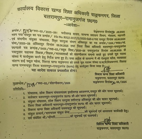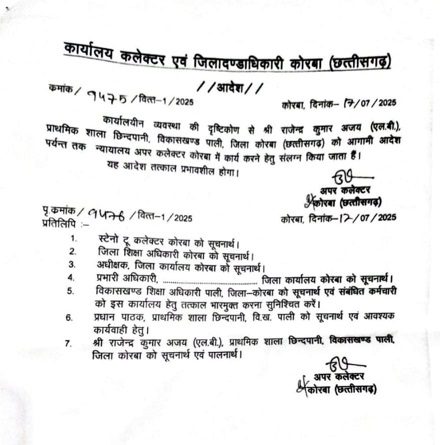 प्राप्त जानकारी अनुसार 17 जुलाई 2025 को अपर कलेक्टर कार्यालय से जारी आदेश में सहायक शिक्षक एलबी राजेंद्र कुमार को अपर कलेक्टर के कोर्ट में अटैच कर दिया गया है। पाली ब्लाक के प्राथमिक शाला छिंदपानी में पदस्थ राजेंद्र कुमार को अपर कलेक्टर के कोर्ट में काम करने का निर्देश जारी किया गया है। विश्वस्त सूत्रों की मानें तो पिछले करीब डेढ़ दशक के सेवाकाल में शिक्षक राजेन्द्र कुमार अजय ने अधिकांश समयावधि कलेक्टोरेट कार्यालय कोरबा के इस शाखा में ही अटैचमेन्ट में गुजारे हैं।