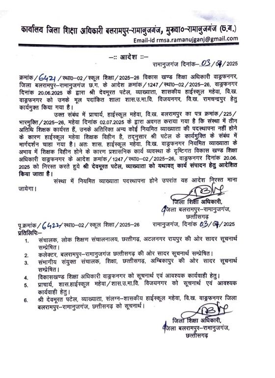 संलग्नीकरण की यह दोषपूर्ण व्यवस्था आकांक्षी जिला कोरबा तक सीमित नहीं है , बलरामपुर जिले में भी इसी तरह की दोषपूर्ण आदेश की चर्चा है। कार्यालय विकासखण्ड शिक्षा अधिकारी वाड्रफनगर बलरामपुर -रामानुजगंज (छ.ग.) द्वारा पत्र क्रमांक 1247 दिनांक 20.06.2025 को एक शिक्षक का संलग्नीकरण आदेश समाप्त करते हुए मूल शाला के लिए कार्यमुक्त कर दिया गया था। बीईओ कार्यालय से जारी आदेश में उल्लेख किया गया था कि छत्तीसगढ़ शासन ,सामान्य प्रशासन विभाग, मंत्रालय महानदी भवन नया रायपुर के पत्र क्रमांक /File No.Rul -3017/2/2025 -GAD-6 नया रायपुर दिनांक 05 .06.2025 एवं संभागीय संयुक्त संचालक ,शिक्षा सरगुजा संभाग अंबिकापुर का पत्र क्रमांक /1258 /स्था. सं.संचा ./2025-26 अंबिकापुर दिनांक 06.06.2025 तथा जिला शिक्षा अधिकारी बलरामपुर -रामानुजगंज (छ.ग.) के पत्र क्रमांक /5455 /स्था -02 /स्कूल शिक्षा /2025 -26 रामानुजगंज दिनांक 06 .06.2025 के पत्रानुसार श्री देवमूरत पटेल ,व्याख्याता संलग्न हाईस्कूल महेवा ,विकासखण्ड -वाड्रफनगर को उनके मूल पदस्थ संस्था उ.मा.वि. विजयनगर ,विकासखण्ड रामचंद्रपुर ,जिला -बलरामपुर -रामानुजंगज (छग)हेतु कार्यमुक्त किया जाता है। हैरान करने वाली बात तो यह रही कि इस आदेश को जारी हुए पखवाड़े भर भी नहीं हुए थे कि कार्यालय जिला शिक्षा अधिकारी बलरामपुर -रामानुजंगज (छग) ने कार्यालयीन पत्र क्रमांक 6421 दिनांक 03 /07-2025 के माध्यम से बीईओ कार्यालय के उक्त आदेश को ही निरस्त कर श्री देवमूरत पटेल ,व्याख्याता को नियमित व्याख्याता की पदस्थापना होने तक कार्य संपादन हेतु यथावत कर दिया था।इसके पीछे की वजह संबंधित संबंधित विद्यालय में नियमित व्याख्याता का अभाव बताया गया था।