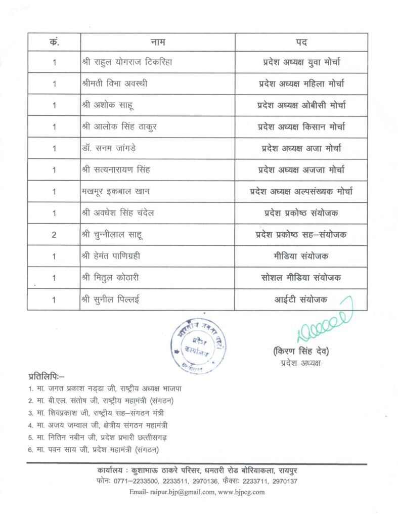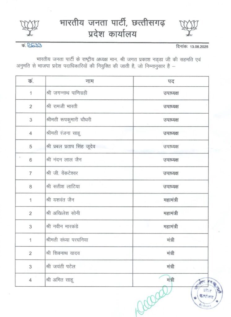 रायपुर, 13 अगस्त (वेदांत समाचार)। छत्तीसगढ़ भाजपा कार्यकारिणी घोषित हो गयी है। भाजपा ने 8 उपाध्यक्ष, तीन महामंत्री, 8 मंत्री बनाये हैं। संतोष पांडेय मुख्य प्रवक्ता होंगे, जबकि 12 प्रवक्ता होंगे।