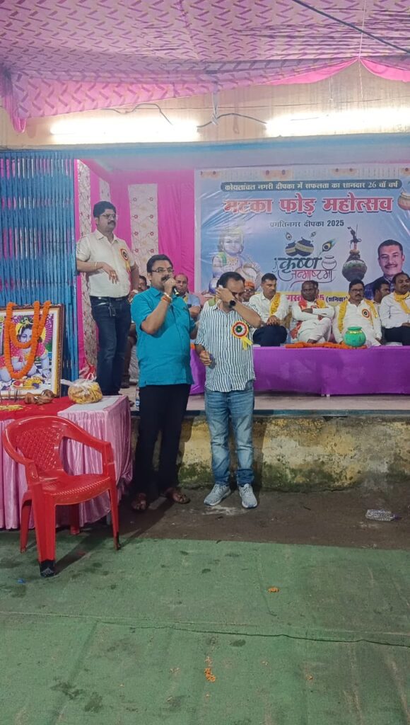 कोरबा, 17 अगस्त (वेदांत समाचार)। श्री कृष्ण जन्माष्टमी के पावन अवसर पर प्रगति नगर राधे कृष्णा मैदान में सफलतापूर्वक 26 वें वर्ष मटका फोड़ महोत्सव दहीहंडी प्रतियोगिता संपन्न हुई देर रात तक चले इस कार्यक्रम में ठीक 12:15 में दही हांडी को फोड़ कर अड़ी कछार की टीम ने एक लाख रुपए का नगद पुरस्कार प्राप्त किया इस अवसर पर अतिथि आसंदी में कटघोरा विधानसभा क्षेत्र के विधायक प्रेमचंद पटेल देश के सबसे बड़े कोयला खदान गेवरा क्षेत्र के महा प्रबंधक अरुण कुमार त्यागी कलिंगा कंपनी के महाप्रबंधक विकास दुबे नगर पालिका अध्यक्ष राजेंद्र राजपूत मौजूद थे ।