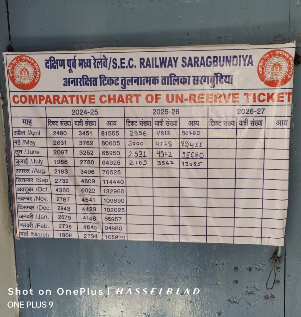 सरगबुंदिया रेलवे स्टेशन को देखें तो गत वित्तीय वर्ष 2024 -25 में इस स्टेशन से 31 हजार 470 टिकट बिके। 48 हजार 64 यात्रियों ने ट्रेन से यात्रा की। टिकट बिक्री के तौर पर रेलवे को 11 लाख 15 हजार 412 रुपए का राजस्व प्राप्त हुआ। इस तरह देखें तो औसतन प्रतिमाह 4 हजार 5 यात्रियों ने सफर की। चालू वित्तीय वर्ष 2025 -26 में जुलाई माह तक अब तक 11 हजार 36 टिकट बिके ,जिसमें 17 हजार 895 यात्रियों ने सफर की। जिससे 3 लाख 42 हजार का राजस्व प्राप्त हुआ है।