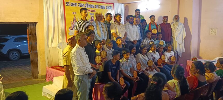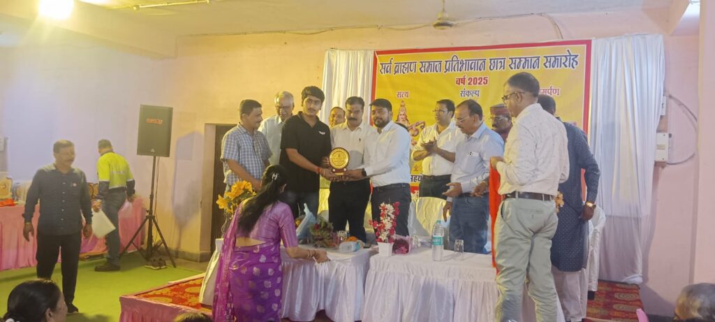 सर्वब्राम्हण समाज कोरबा द्वारा 18 अगस्त सोमवार को कोरबा के पंचमुखी हनुमान मंदिर के समीप स्थित ब्रम्हवाटिका में समाज के प्रतिभावान छात्र-छात्राओं को सम्मानित करने हेतु सम्मान समारोह का आयोजन किया गया। सम्मान समारोह में अपनी गरिमामयी उपस्थिति प्रदान करते हुए निगम आयुक्त श्री आशुतोष पाण्डेय ने प्रतिभावान बच्चों को सम्मानित किया, इस अवसर पर जिला शिक्षा अधिकारी टी.पी.उपाध्याय भी उपस्थित थे। सम्मान समारोह के दौरान समाज के ऐसे बच्चों जिन्होने वर्ष 2025 में कक्षा 10वीं, 12वीं में 90 प्रतिशत या उससे अधिक अंक अर्जित किए एवं वर्ष 2024 एवं 2025 में पी.एस.सी., आई.आई.टी., आई.आई.एम. तथा अन्य महत्वपूर्ण प्रतियोगी परीक्षाओं में चयनित हुए, को सम्मानित किया गया।