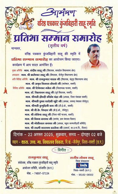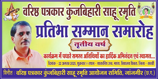 सक्ती,21अगस्त (वेदांत समाचार). वरिष्ठ पत्रकार कुंजबिहारी साहू की स्मृति में ‘प्रतिभा सम्मान समारोह’ 22 अगस्त को दोपहर 2 बजे आयोजित होगा. घिवरा गांव के हायर सेकेंडरी स्कूल में आयोजित सम्मान कार्यक्रम में 15 प्रतिभा छात्र-छात्राओं का सम्मान किया जाएगा. आयोजन का यह तृतीय वर्ष है.