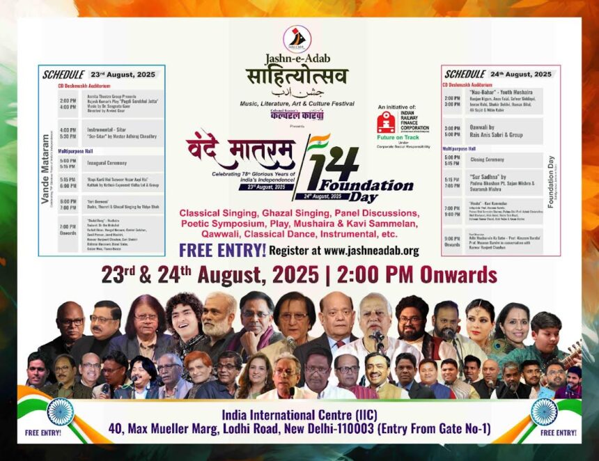 - 23 और 24 अगस्त, 2025 को भारत की स्वतंत्रता की 79वीं और जश्न-ए-अदब साहित्योत्सव की 14वीं वर्षगाँठ का गवाह बनेगा ‘वंदे मातरम’शास्त्रीय गायन, गज़ल और लोकसंगीत, सूफी और पारंपरिक गीत, कवि सम्मेलन, मुशायरा, पैनल चर्चाएँ, नाट्य और नृत्य आदि पर होंगी दमदार प्रस्तुतियाँ